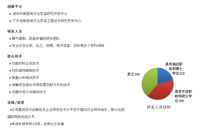 新宙邦現(xiàn)擁有南通宙邦高純化學(xué)品有限公司、惠州市宙邦化工有限公司以及新宙邦(香港)有限公司等3家全資子公司;有深圳、南通和惠州(在建)三個(gè)電子化學(xué)品生產(chǎn)基地。現(xiàn)有員工近600人,其中85%以上具有大中專以上學(xué)歷。公司高度重視科技創(chuàng)新,已在國(guó)內(nèi)外申請(qǐng)發(fā)明專利16項(xiàng),對(duì)新型電子化學(xué)品的技術(shù)進(jìn)步和產(chǎn)業(yè)發(fā)展做出了卓越的貢獻(xiàn)。深圳新宙邦是國(guó)家高新技術(shù)企業(yè),下屬公司南通宙邦是江蘇省高新技術(shù)企業(yè)。