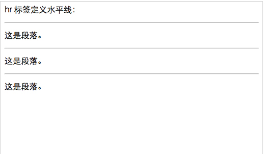<html> <body> <p>hr 標簽定義水平線:</p> <hr /> <p>這是段落。</p> <hr /> <p>這是段落。</p> <hr /> <p>這是段落。</p> </body> </html>