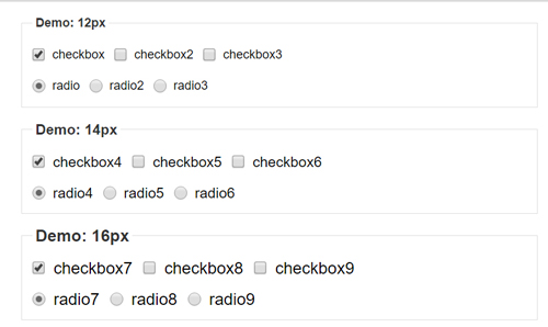 .form { font: 14px/18px Arial, Helvetica, sans-serif; } .form input, .form label { vertical-align: middle; } .form label { margin-right: 6px; } .form_checkbox, .form_radio { margin: 0 3px 0 0;/*與右側文字的間距*/ padding: 0; width: 13px; height: 13px; /*ie7 ie6 根據不同的 font-size 設置不同的值*/ *vertical-align: 1px; }